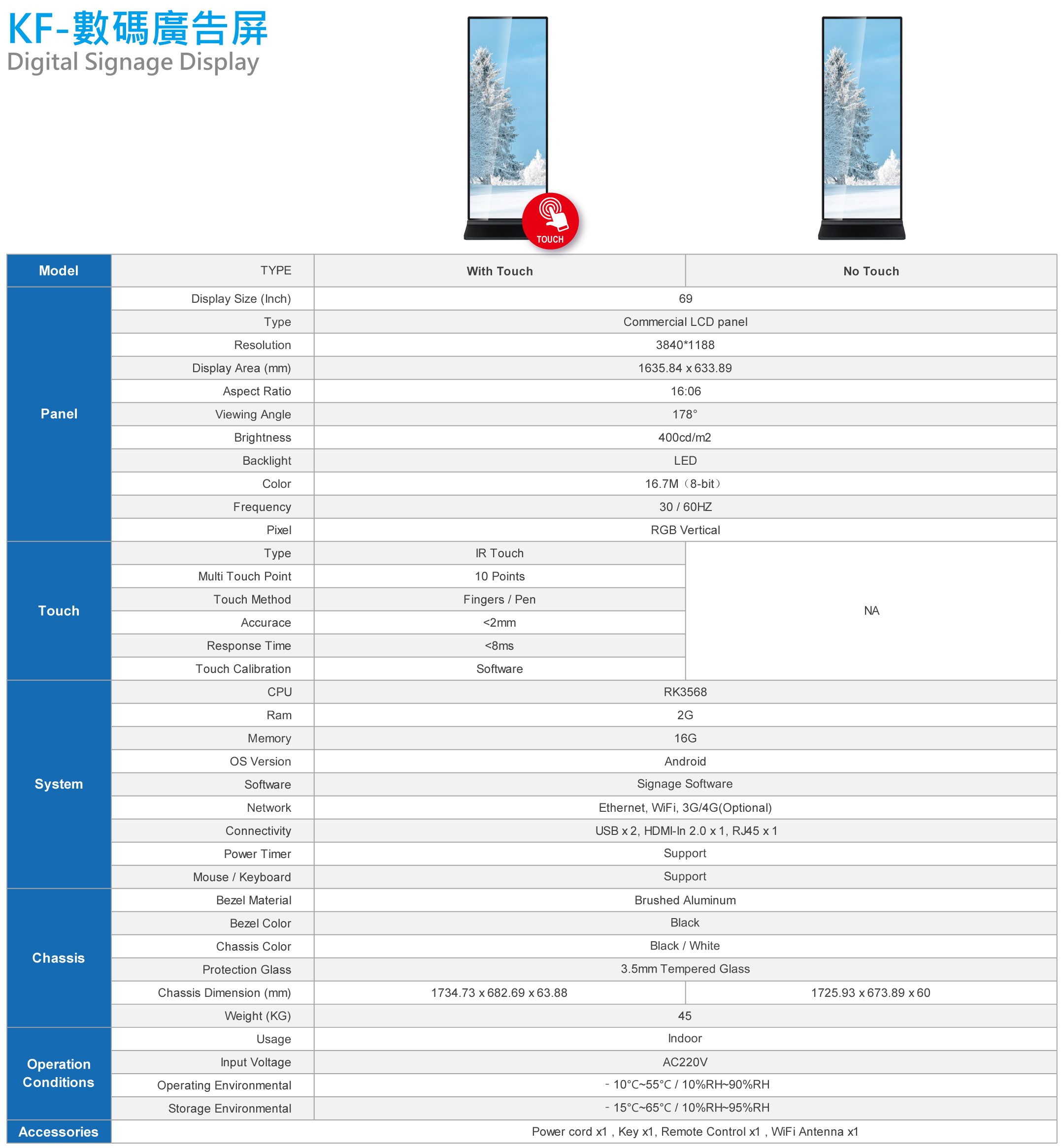 数位时代的创新选择,全面探用 4K 高划质面板,适用餐饮、饭店、学校、大小型活动等多种场合,简单的操作方式及简约质感的外型让您的广宣更加生动。